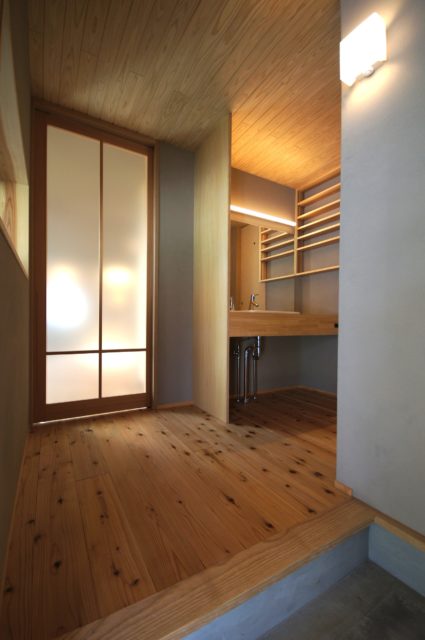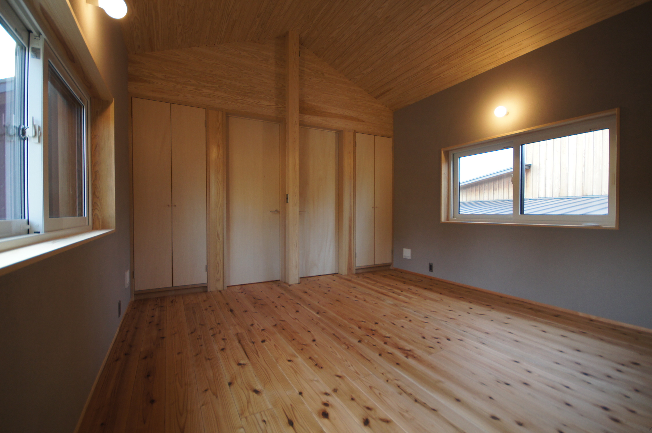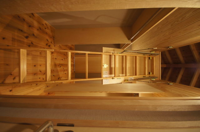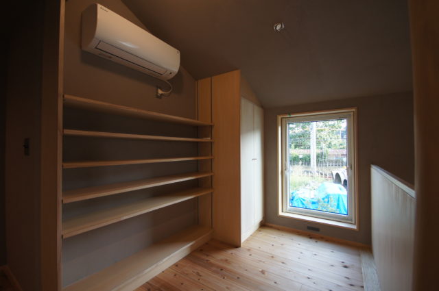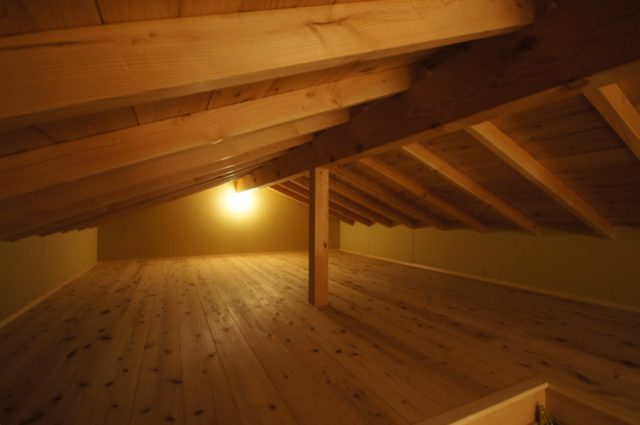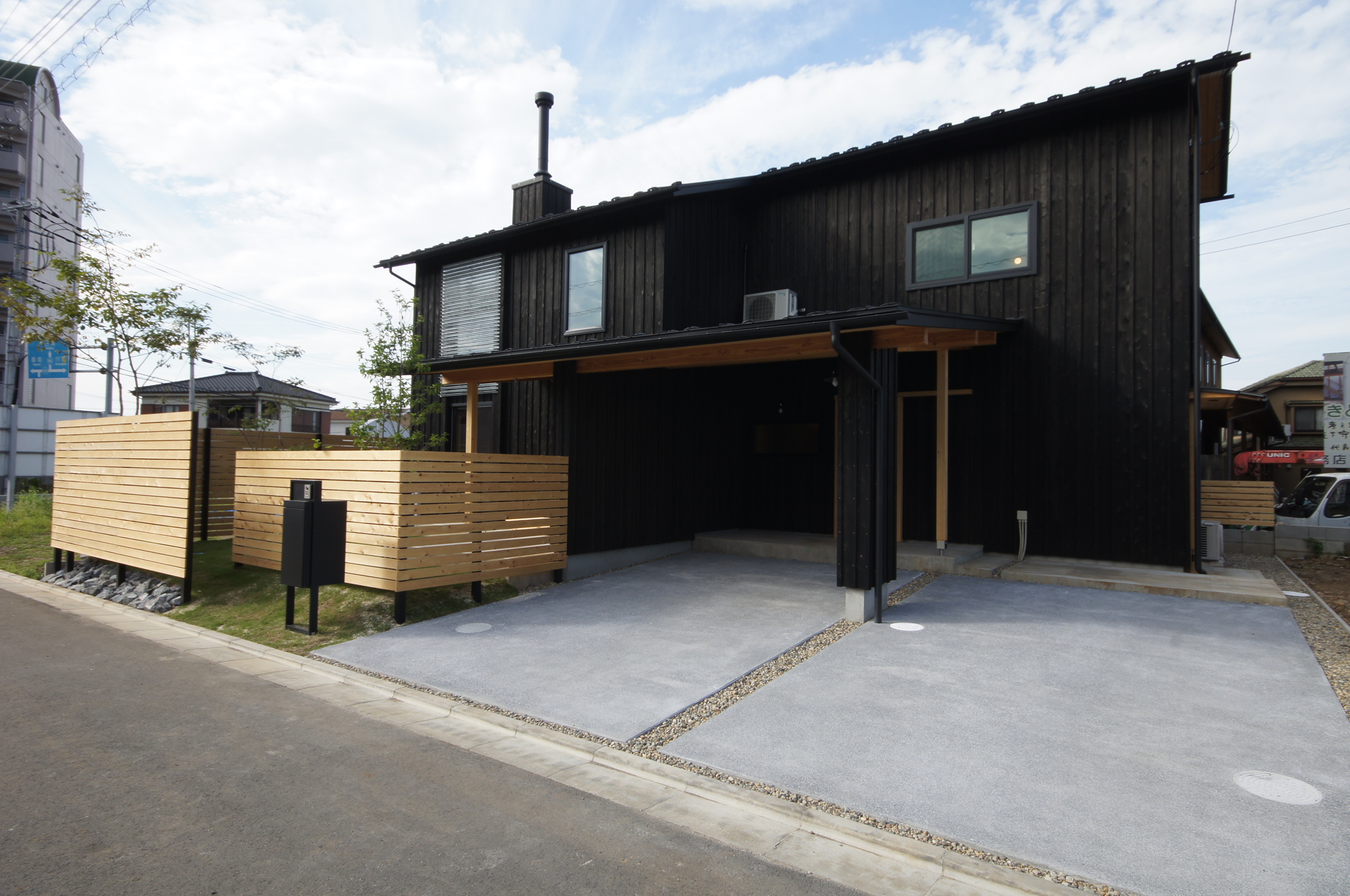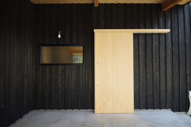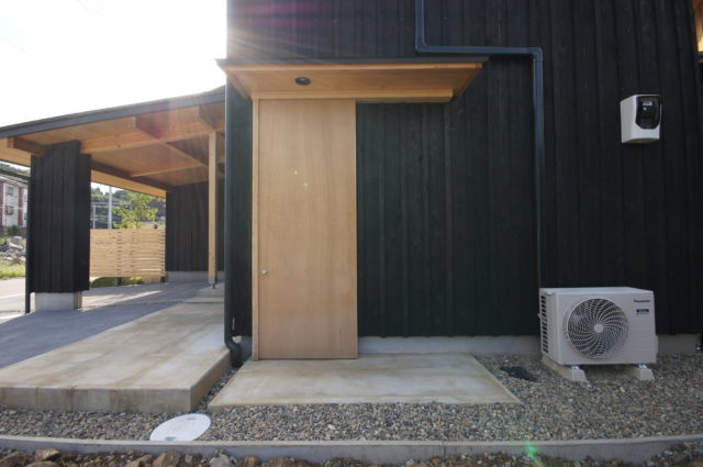 大きな屋根を一続きにして車の置き場も組み込んだ家。