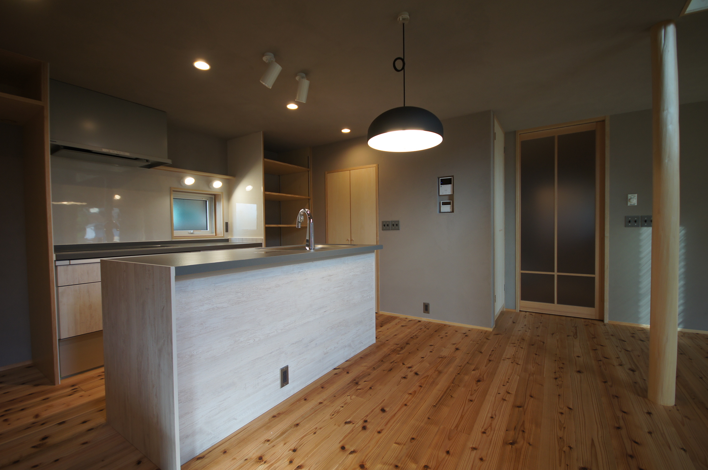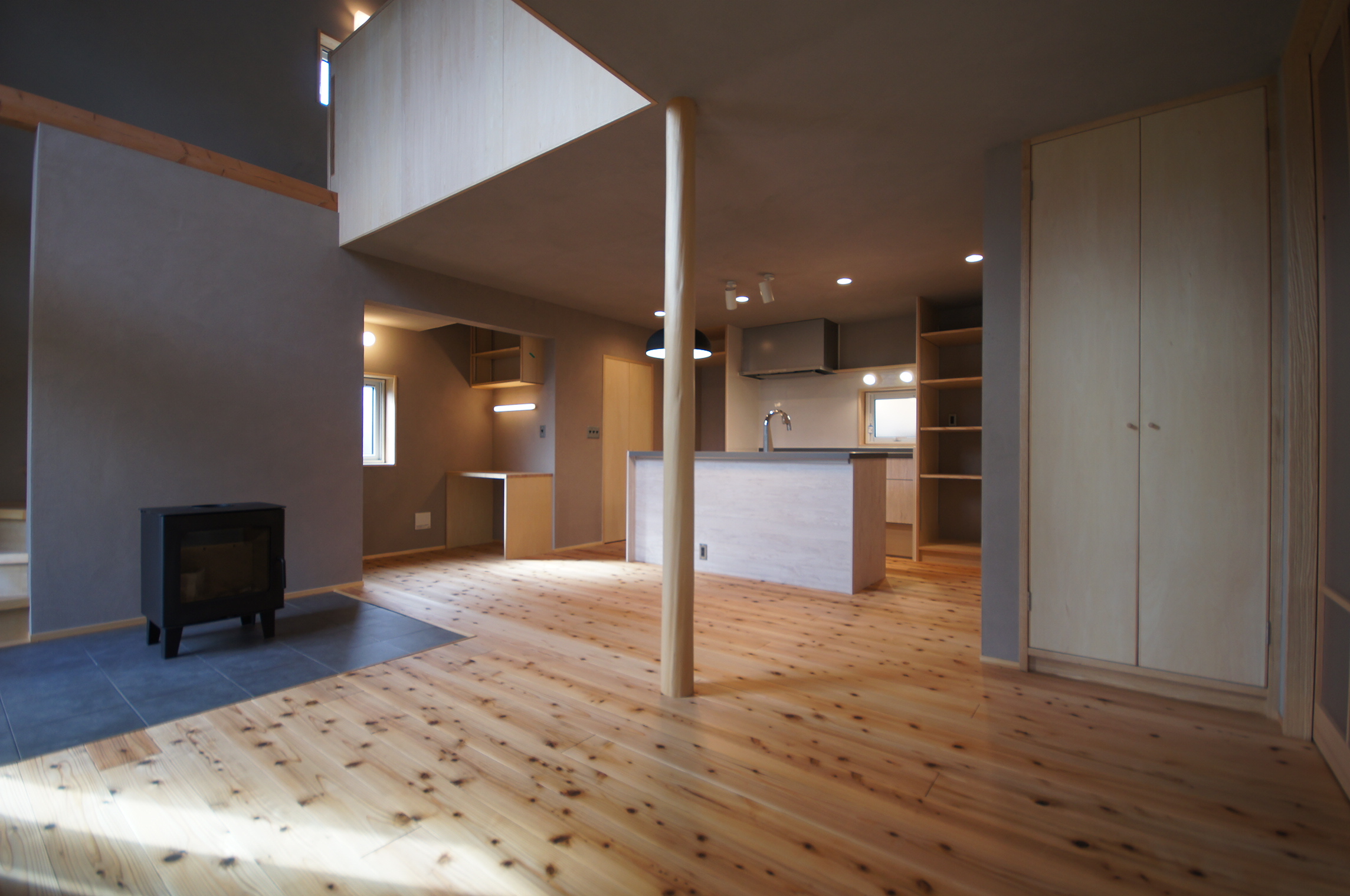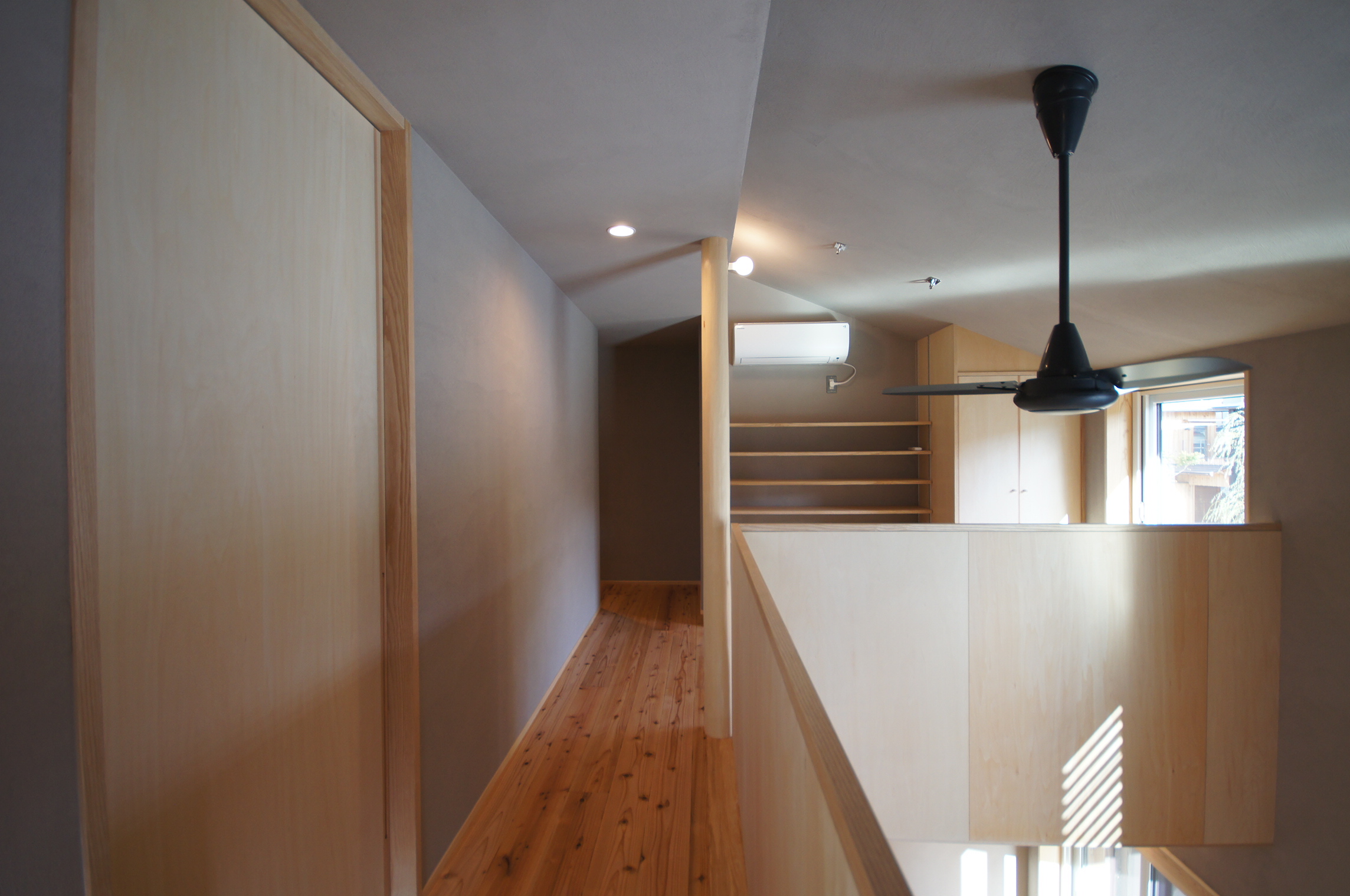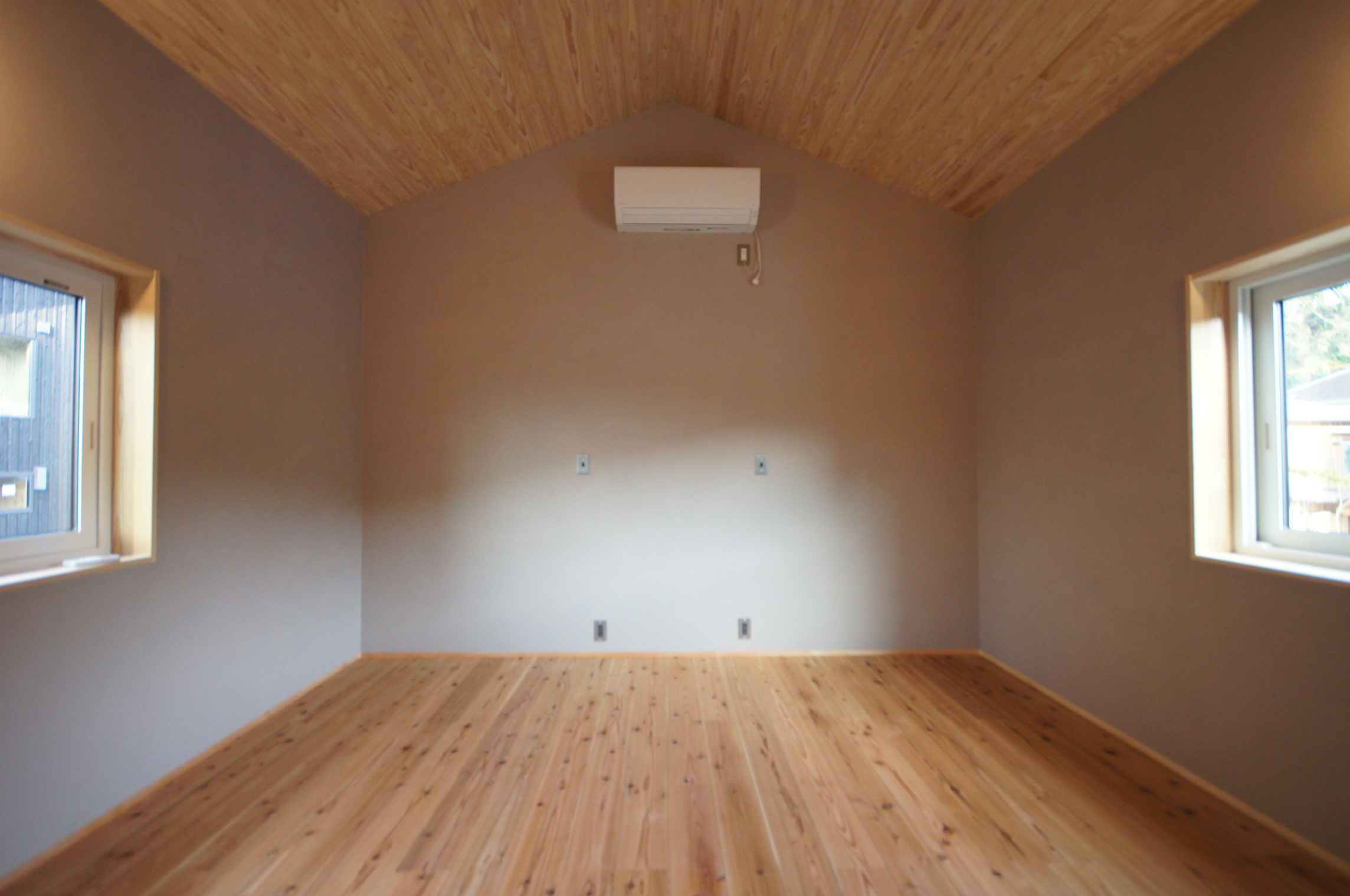 大きな屋根を一続きにして車の置き場も組み込んだ家。