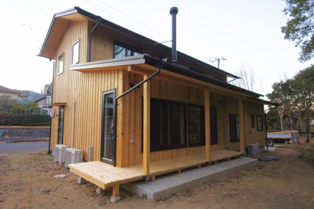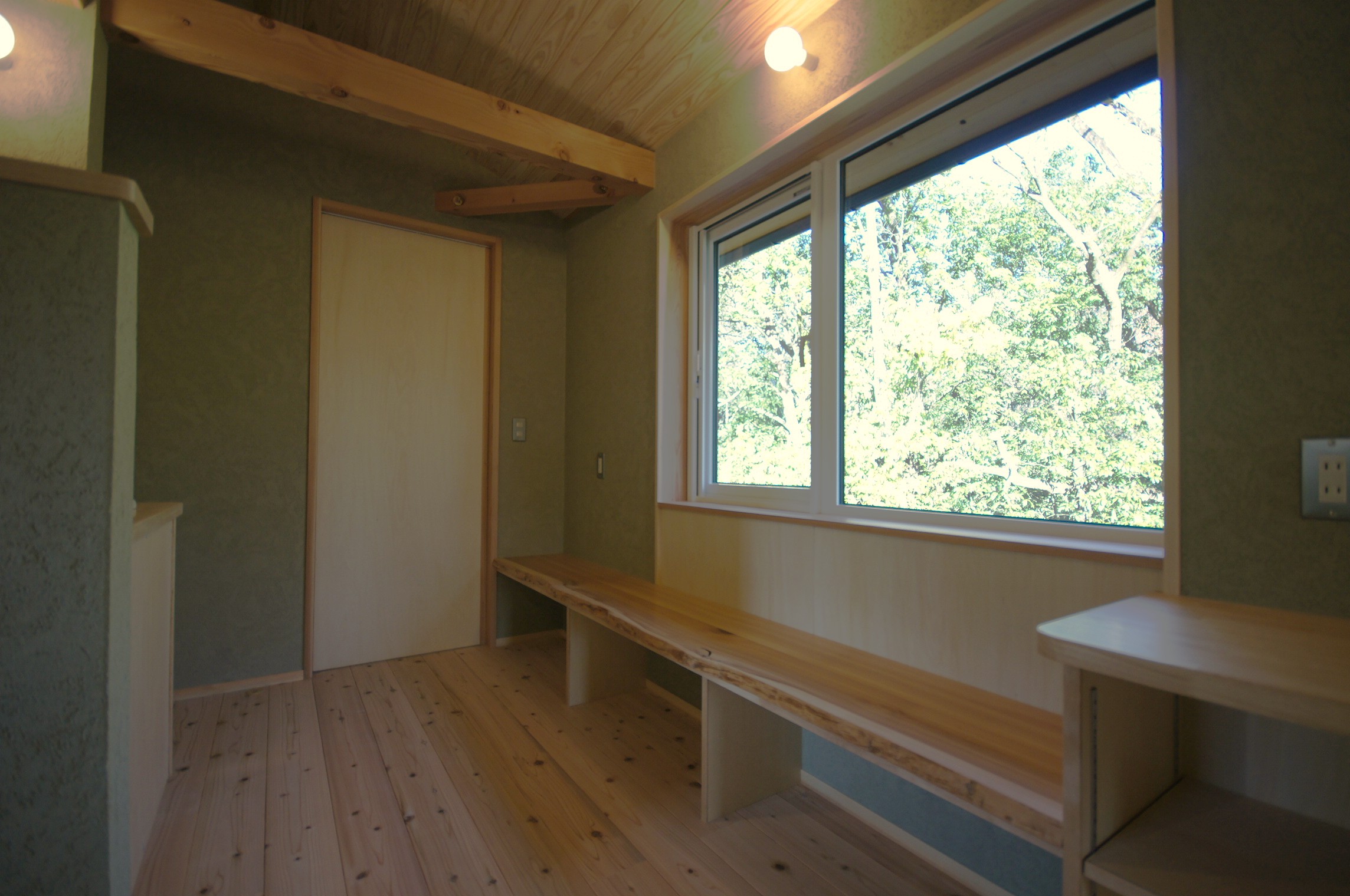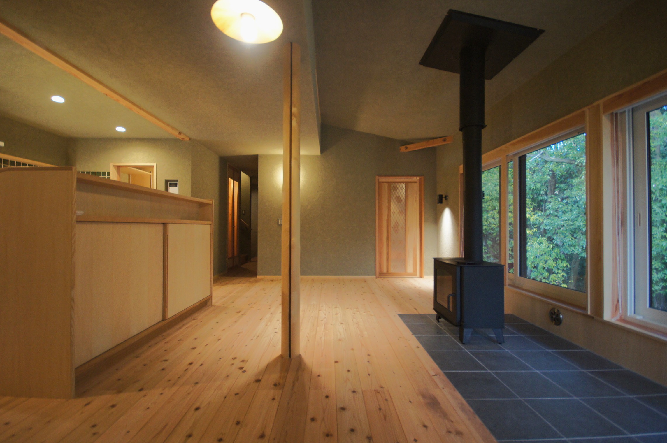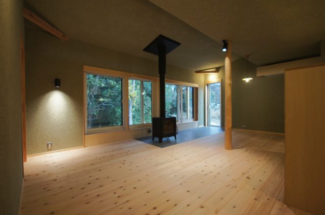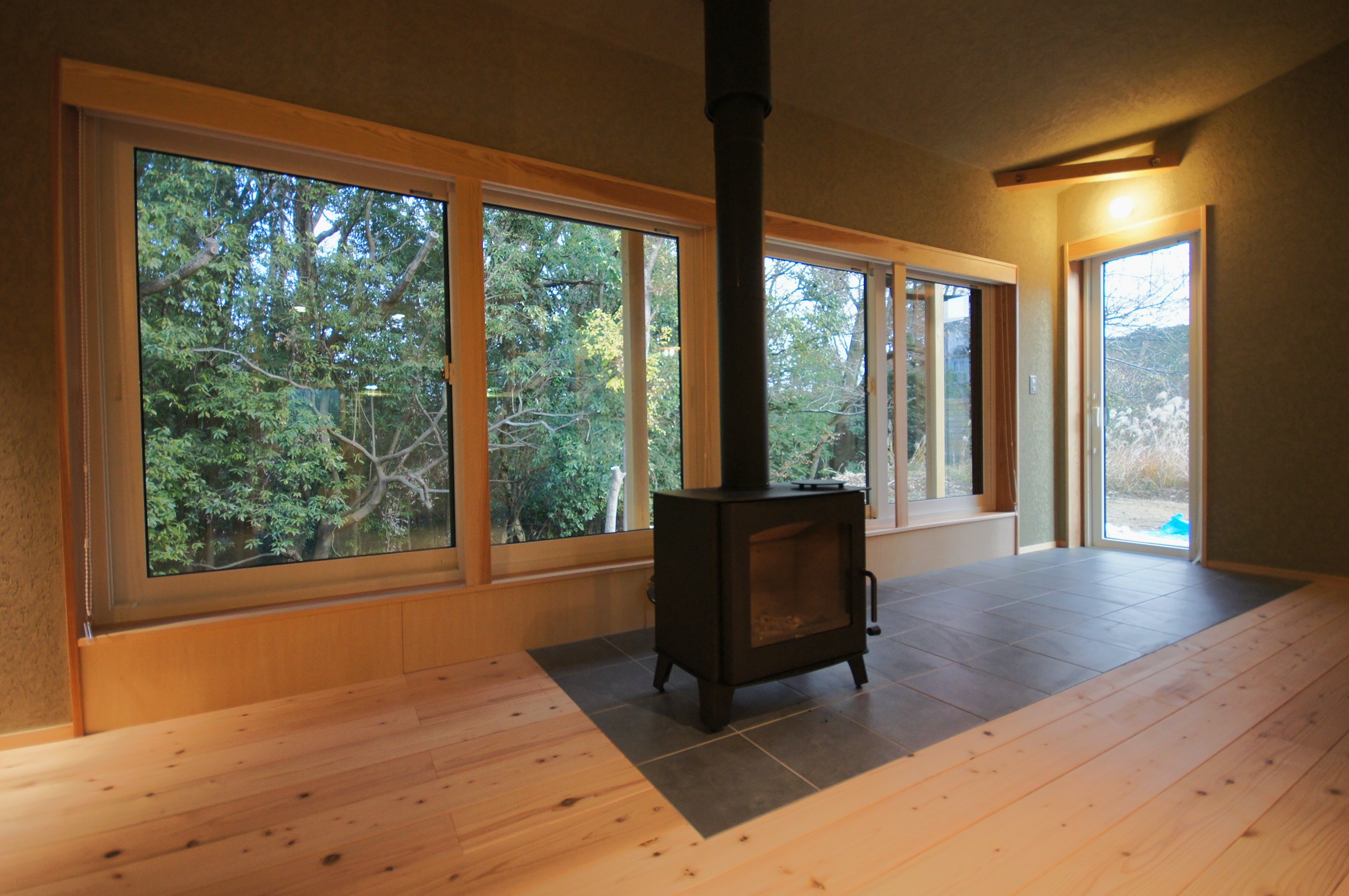 薪ストーブの揺らめく炎を眺めつつその先に見える深い森を感じる窓・・・